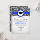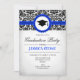 Graduation party invitation for women. Elegant royal blue and white design with damask, script font and a cap. Perfect for a classy graduation party.