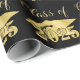 Graduation wrapping paper featuring a repeating pattern of CLASS OF YEAR (editable year) in gold with a faux metallic gold foil graduation cap or mortarboard against your choice of colour background (shown in an editable black). Use for wrapping graduation gifts or as display backdrops or table coverings at the graduation party. ASSISTANCE: For help with design modification or personalisation, colour change, resizing, transferring the design to another product or if you would like coordinating items, contact the designer BEFORE ORDERING via the Zazzle Chat MESSAGE tab below or email makeitaboutyoustore@gmail.com.