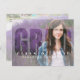 This design features a budget friendly postcard for graduation graduate grad party, modern simple grad typography, with a QR code scan me for your party URL website. with a vellum photo text overlay, a high school or college senior,2 two photo layout templates, graduation grad party invitations, with a clear transparent font overlay, photo graduation announcements, double-sided grad photo cards, a unique cool modern contemporary style