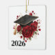 Graduation ornament is shown with a grad cap, and pretty red roses print with date.