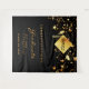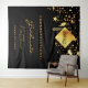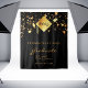 A chic black background. Decorated with dripping golden stars and a modern, abstract faux gold cap, hat, tassel topper with the year inside. Text: Congratulations! The text: Graduate, and the name are written with a large modern hand lettered style script. For both him and her. A banner , party decoration, or photo booth, backdrop for a 2025 (or any year) graduation party.