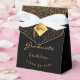 Class of 2025 (or any year). For a modern and trendy graduation celebration. A chic black background with golden confetti. The text: Graduate is written with a large hand lettered style script, golden letters. Template for a name and year. Decorated with a modern abstract faux gold cap, tassel topper.