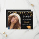 On front: Add your own vertical size photo of the graduate. An arch shaped frame. A chic black background colour, decorated with faux gold stars. Personalise and add a name and date. The name and the text: Save the Date are written with a modern hand lettered style script.