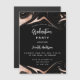 A modern style invitation for a graduation party. A black background decorated with rose gold swirls. Personalise and add a name and party details. The text Graduation and the name are written with modern hand lettered style script. White coloured text.