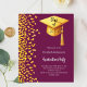 A modern, elegant Graduation party invitation. A burgundy background decorated with faux gold confetti and a large golden graduation cap with tassel. Personalise and add a name and party details. White text.