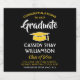 Add a personalised touch to college or high school graduation party decorations with these elegant black, white, and gold yellow beer bottle labels. Design features a black background, a yellow mortar board cap, stylish modern typography, handwritten style script calligraphy, and a customisable message reading "Congratulations to our Graduate". Text at the bottom includes class year, school name, and optional lines for degree, beverage type, or other info. All text is simple to customise. These labels make a stylish graduation party drink idea and an elegant addition to the graduate's special day celebration. Cheers!