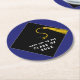 Graduation party favour gifts featuring classic black and gold graduation cap on blue background. Customise text to add senior class year.
