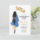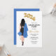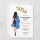 Graduation Party Invitation female portrait drawing black dress, blue cap and gown, long dark hair. 2023 gold balloons.