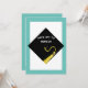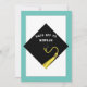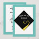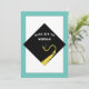 Unique graduation party invites featuring black and gold grad cap and teal blue border. To customise edit text.