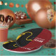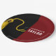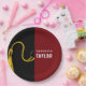 Creative graduation congrats party plates featuring classic black and gold cap on a maroon background. Edit text to add grad's name.