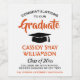 Add a personalised touch to college or high school graduation party decorations with these elegant orange, white and black wine bottle labels. Design features a white background, black mortar board cap, stylish modern typography, handwritten style script calligraphy, and a customisable message reading "Congratulations to our Graduate". Text at the bottom includes class year, school name, and optional lines for degree, beverage type, or other info. All text is simple to customise. These labels make a stylish graduation party drink idea and an elegant addition to the graduate's special day celebration. Cheers!