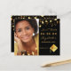 On front: Add your own vertical size photo of the graduate. A chic black background color, decorated with faux gold stars. Personalize and add a name and date. Golden letters. The name and the text: Save the Date are written with a modern hand lettered style script.