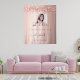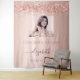 A rose gold , pink gradient background with confetti. Personalise and add your own high quality photo of the graduate. The text: The name is written in dark rose gold with a modern hand lettered style script with swases. To keep the swashes only delete the sample name, leave the spaces or emoji's in front and after the name. Can be used as wall decor for the party or as a photo booth backdrop.