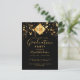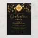 An elegant, simple invitation card for a graduation party for both him and her. A black background and a modern black abstract tassel topper in faux gold with the year inside. Decorated with falling golden stars. Personalise and add a name and party details. The text Graduation and the name are written with modern handlettered style script. Golden coloured text.