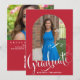This design features a graduate graduation grad photo, an elegant minimalist modern arch picture, with a trendy stylish calligraphy script font, with school colours cardinal red style, for high school or college seniors, with classic elegant typography design, a fancy creative calligraphy script, a graduation grad party invitation card, an elegant graduation announcement card, with simplistic elegance modern style