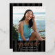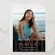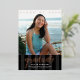 Be proud, rejoice and announce to the world that your favourite grad has reached their milestone with this stunning, simple, modern, personalised announcement invite. Sparkly, elegant, real rose gold foil calligraphy script, white sans serif typography and a photo of your choice overlay a black and dark grey striped background. Personalise the custom text with your graduate’s name, school name, class year, and graduation date. On the back, add your personal note, next school they’re attending, party information, etc. Matching and coordinating thank you cards, cap toppers, fans, napkins, plates, banners and other graduation goodies are also available in this trendy and stylish collection. Guaranteed to add stylish fun to their special occasion!