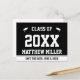 This black and white postcard says 'Class of 20xx' in large white text. (You can change the year if you need to.) There's display text you can edit to show the graduate's name. White graduate's caps are on either side of the phrase "Class Of". At the bottom, there's a line of black display text for your custom save the date message.
