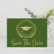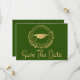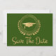 This is modern simple and elegant classic gold and green school coloured Save the Date announcement card. Modern style text. Add your own message on the back of the cards giving details to your family and friends to save the date for a graduation ceremony, event, party or other occasion. Logo style design includes laurel leaves, stars and a graduation cap.