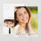 A modern graduation thank you postcard featuring the graduate's photo overlayed with "thank you" in an elegant script and their name and class year in simple typography. On the reverse side, add an additional photo, customise a thank you message and add the grad's name in a signature-like script.