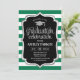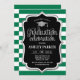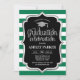 Graduation party invitation for men or women. Elegant invite card in green, black, white and silver. Modern simple design featuring stripes, a cap, faux glitter silver and typography script font. Perfect for a stylish graduation celebration.