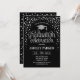 Graduation party invitation for men or women. Elegant invite card in black and silver. Modern simple design featuring faux glitter confetti, a cap and typography script font. Perfect for a stylish graduation celebration.