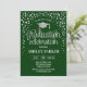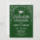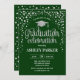 Graduation party invitation for men or women. Elegant invite card in green and silver. Modern simple design featuring faux glitter confetti, a cap and typography script font. Perfect for a stylish graduation celebration.