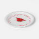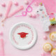 Pretty red and white school colours paper plates for your graduation celebration. Red cap/ mortar board with a white tassel and diploma with red ribbon. Background colour can be changed to any colour you like. Change name to your own, add your year of graduation.
