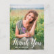 This custom photo graduation thank you postcard features a photo on the front with the word "Thank You" in white script with your name to personalize. Add a message of thanks on the back of the card and signature accented by a black graduation cap on white. Designed by artist ©Susan Coffey.