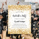A stylish white background. Decorated with faux gold glitter dust. Personalise and add a name and party details. The name is written with a hand lettered style script