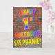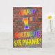 The front of this exciting, eye-catching and vibrant birthday-themed greeting card design features the message "HAPPY 1ST BIRTHDAY" with letters having a multicolored rainbow like gradient pattern, and a customisable name coloured yellow, on a brick wall pattern background. The style is inspired by that of graffiti or street art drawn on wall. The inside features a birthday greeting message that can be personalised. A happy, fun, customised birthday greeting card like this might be given to somebody who is celebrating their first birthday. [~Z0000357]