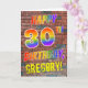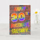 The front of this exciting, eye-catching and fun birthday-themed greeting card design features the message "HAPPY 30TH BIRTHDAY" with letters having a multicolored rainbow like gradient pattern, and a custom name colored yellow, on a wall-of-bricks pattern background. The style is inspired by that of graffiti or street art drawn on a wall. The inside features a birthday greeting message that can be customized. A happy, fun, customized birthday greeting card like this might be given to celebrate somebody’s 30th birthday. [~Z0000357]