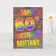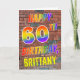 The front of this fun, eye-catching and vibrant birthday-themed greeting card design features the message "HAPPY 60TH BIRTHDAY" with letters having a multicolored rainbow like gradient pattern, and a personalized name colored yellow, on a wall-of-bricks pattern background. The style is inspired by that of graffiti or street art drawn on a wall. The inside features a birthday greeting message that can be customized. A happy, fun, customizable birthday greeting card like this might be given to somebody celebrating their sixtieth birthday. [~Z0000357]