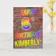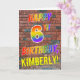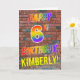 The front of this eye-catching, vibrant and exciting birthday-themed greeting card design features the message "HAPPY 6TH BIRTHDAY" with letters having a multicolored rainbow like gradient pattern, and a custom name coloured yellow, on a wall-of-bricks pattern background. The look is inspired by that of graffiti or street art drawn on a wall. The inside features a birthday greeting message that can be personalised. A fun, happy, editable birthday greeting card like this might be used to send a birthday greeting message to somebody celebrating their sixth birthday. [~Z0000357]
