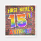 The front of this exciting, eye-catching and vibrant birthday-themed paper napkin design features a personalised name, and the message "15TH BIRTHDAY!" with letters having a multicolored rainbow spectrum inspired gradient pattern, on a wall-of-bricks inspired pattern background. The look is inspired by that of graffiti or street art drawn on a wall. Fun paper napkins like this might be used at a birthday party being held to honour somebody who is celebrating their fifteenth birthday. [~Z0000367]