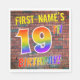 The front of this fun, exciting and vibrant birthday-themed paper napkin design features a personalised name, and the message "19TH BIRTHDAY!" with letters having a multicolored rainbow spectrum inspired gradient pattern, on a brick wall inspired pattern background. The appearance is inspired by that of graffiti or street art drawn on a wall. Fun paper napkins like this might be used at a birthday party being held to honour somebody who is celebrating their 19th birthday. [~Z0000367]