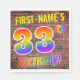 The front of this eye-catching, vibrant and exciting birthday-themed paper napkin design features a customisable name, and the message "33RD BIRTHDAY!" with letters having a multicolored rainbow spectrum inspired gradient pattern, on a wall-of-bricks inspired pattern background. The style is inspired by that of graffiti or street art drawn on a wall. Fun paper napkins like this might be used at a birthday party being held in honour of somebody’s thirty third birthday. [~Z0000367]