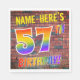 The front of this eye-catching, exciting and fun birthday-themed paper napkin design features a customisable name, and the message "57TH BIRTHDAY!" with letters having a multicolored rainbow spectrum inspired gradient pattern, on a wall-of-bricks inspired pattern background. The style is inspired by that of street art or graffiti drawn on a wall. Fun paper napkins like this might be used at a birthday party being held to celebrate somebody’s 57th birthday. [~Z0000367]