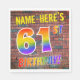 The front of this eye-catching, vibrant and exciting birthday-themed paper napkin design features a customisable name, and the message "61ST BIRTHDAY!" with letters having a multicolored rainbow spectrum inspired gradient pattern, on a wall-of-bricks inspired pattern background. The appearance is inspired by that of street art or graffiti drawn on a wall. Fun paper napkins like this might be used at a birthday party for somebody who is celebrating their sixty first birthday. [~Z0000367]