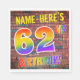 The front of this exciting, vibrant and fun birthday-themed paper napkin design features a custom name, and the message "62ND BIRTHDAY!" with letters having a multicolored rainbow spectrum inspired gradient pattern, on a brick wall inspired pattern background. The look is inspired by that of street art or graffiti drawn on a wall. Fun paper napkins like this might be used at a birthday party being held to celebrate somebody’s sixty second birthday. [~Z0000367]