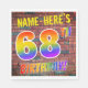 The front of this vibrant, exciting and eye-catching birthday-themed paper napkin design features a personalised name, and the message "68TH BIRTHDAY!" with letters having a multicolored rainbow spectrum inspired gradient pattern, on a wall-of-bricks inspired pattern background. The appearance is inspired by that of graffiti or street art drawn on a wall. Fun paper napkins like this might be used at a birthday party being held to commemorate somebody’s 68th birthday. [~Z0000367]