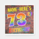 The front of this vibrant, exciting and eye-catching birthday-themed paper napkin design features a personalised name, and the message "73RD BIRTHDAY!" with letters having a multicolored rainbow spectrum inspired gradient pattern, on a wall-of-bricks inspired pattern background. The look is inspired by that of street art or graffiti drawn on a wall. Fun paper napkins like this might be used at a birthday party being held in honour of somebody’s 73rd birthday. [~Z0000367]