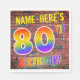 The front of this exciting, vibrant and fun birthday-themed paper napkin design features a personalised name, and the message "80TH BIRTHDAY!" with letters having a multicolored rainbow spectrum inspired gradient pattern, on a wall-of-bricks inspired pattern background. The style is inspired by that of graffiti or street art drawn on a wall. Fun paper napkins like this might be used at a birthday party being held to commemorate somebody’s eightieth birthday. [~Z0000367]