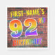 The front of this eye-catching, exciting and fun birthday-themed paper napkin design features a custom name, and the message "92ND BIRTHDAY!" with letters having a multicolored rainbow spectrum inspired gradient pattern, on a brick wall inspired pattern background. The appearance is inspired by that of street art or graffiti drawn on a wall. Fun paper napkins like this might be used at a birthday party for somebody who is celebrating their 92nd birthday. [~Z0000367]