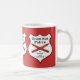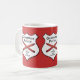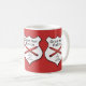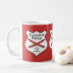 The Grammar Police are here! A funny coffee mug for the teacher or grammar nerd, showing 3 badge shaped white graphics with crossed red crayons and "Grammar Police to serve and correct" in black type. The background colour is customisable on the Edit menu.