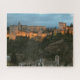 The iconic Alhambra in Granada, Spain illuminated at night with rooftops and chimneys of the old town below.