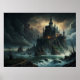Step into a world of dark enchantment with this grand gothic castle illustration, depicting a majestic castle perched atop rugged cliffs, surrounded by turbulent waves and ominous storm clouds.