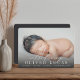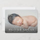 An elegant birth announcement design featuring a full bleed horizontal or landscape orientated photo with "introducing [name]" along the bottom in chic calligraphy script and classic serif lettering. Your baby's birth stats and your family signature appear beneath. Add three additional square photos to the back.