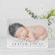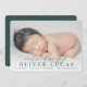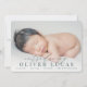 An elegant birth announcement design featuring a full bleed horizontal or landscape orientated photo with "introducing [name]" along the bottom in chic calligraphy script and classic serif lettering. Your baby's birth stats and your family signature appear beneath. Add three additional square photos to the back.