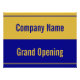 A grand opening sign lets everyone know your business has opened its doors to the public. The faux gold text at the bottom says 'Grand Opening'. The gold text is on a navy blue stripe. A faux gold stripe at the top has navy blue display text for the company name.