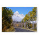 Photograph of Moose Wilson Road heading into Grand Teton National Park during fall with snow-covered Grand Teton in the distance.